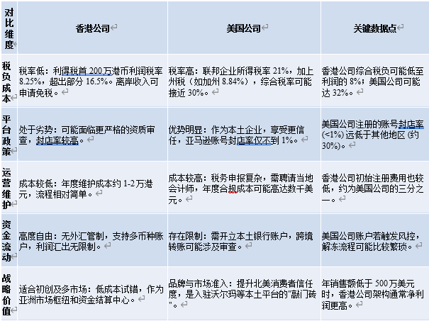 若多平台/多国家铺货、依赖中国供应链、短期无融资上市计划,优先选择香港公司;若All in北美市场、重研发/品牌型、拟引入美元基金或IPO,优先选择美国公司。