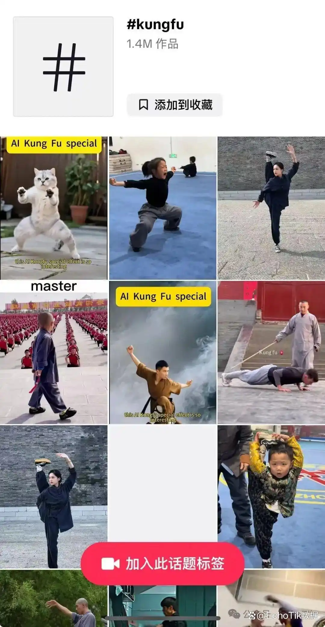 话题标签 #kungfu 下已经积累了将近140万个短视频作品。