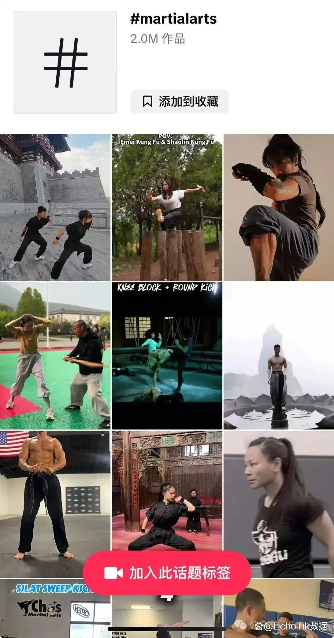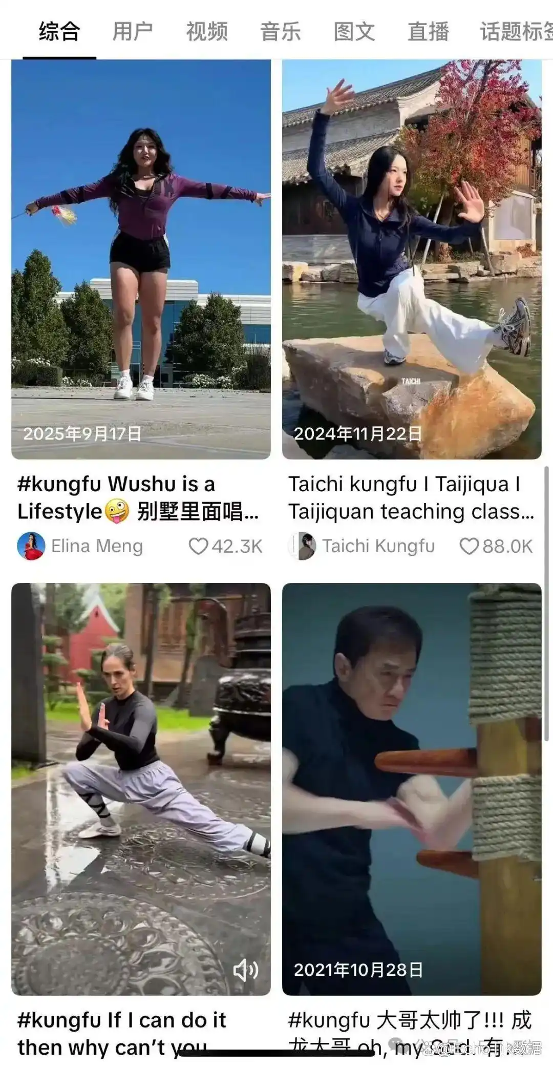 除了 #kungfu 外,#martialarts(武术)、#skills(技巧)、#fighting(格斗)等相关标签的播放量也都在十亿级别甚至更高,说明与武术动作、训练、技巧类内容在 TikTok 上有很强的用户关注度和传播量。