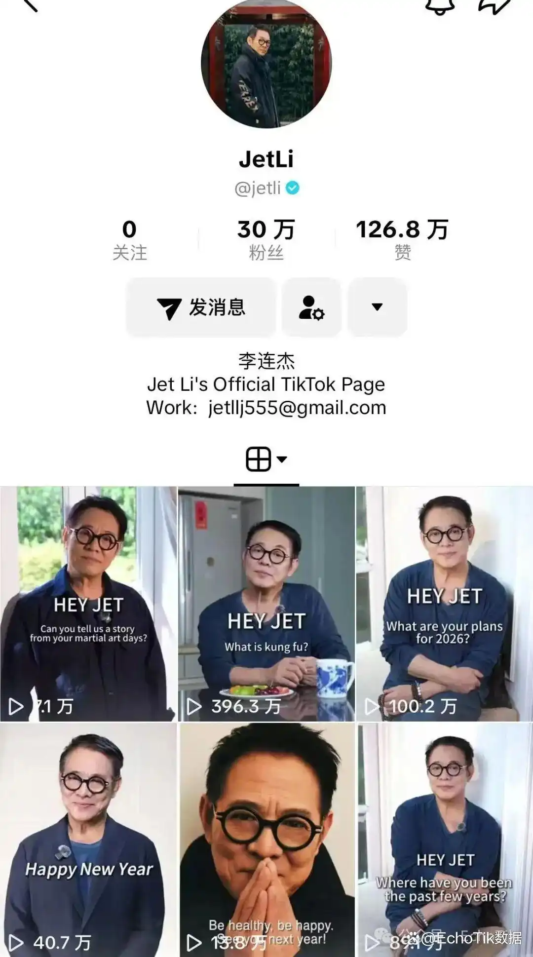 距离2025年12月17日发布第一条短视频,过去不到短短一个月时间,李连杰(@jetli)TikTok账号已经吸引了超过30万的粉丝关注,最高播放量高达600多万!