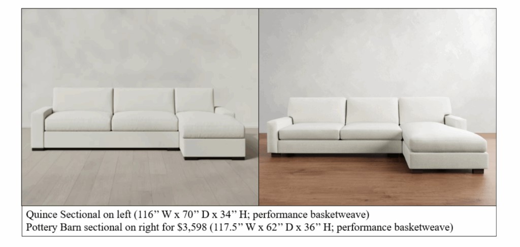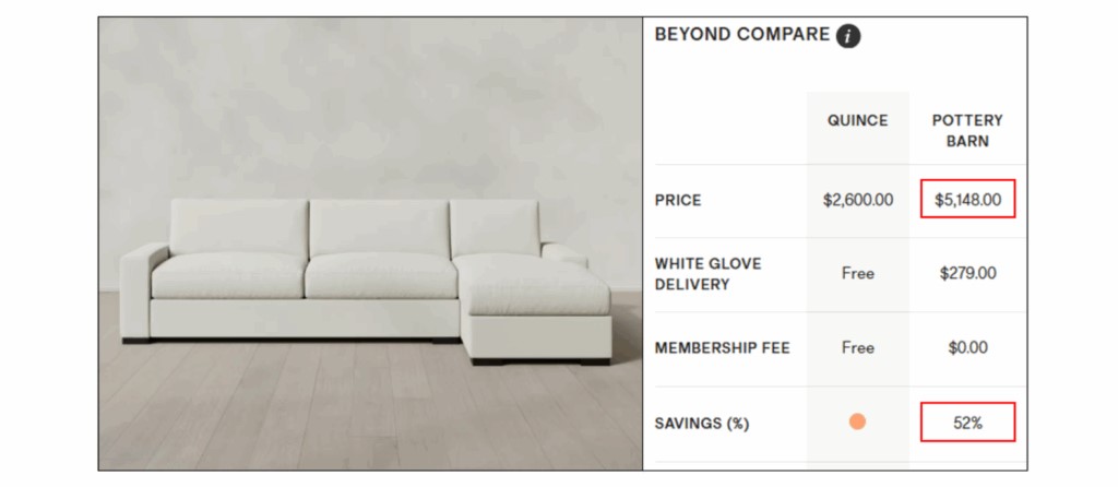 家居巨头威廉姆斯-索诺玛(Williams-Sonoma, Inc.)近期对平替品牌Quince提起的诉讼,更是直接放弃了侵权索赔主张,将争议核心聚焦于Quince推出的“Beyond Compare”对比图表及相关广告话术,质疑其宣称产品与旗下品牌“材质、品质、供应链等方面实质相同”及“节省52%”等宣传的真实性。