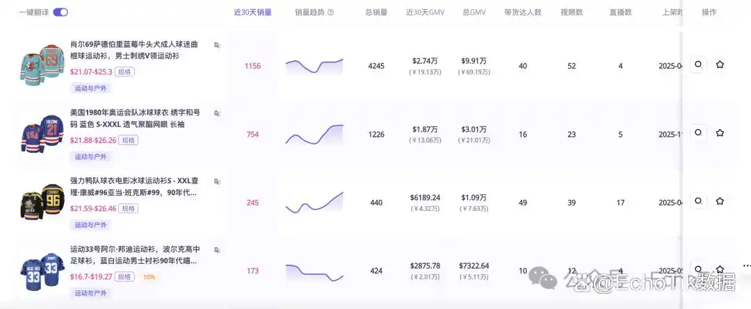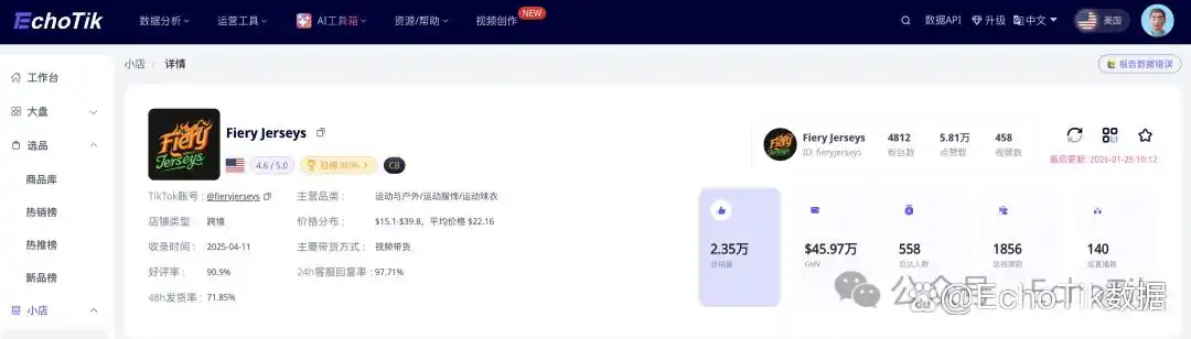TikTok上有多家店铺球衣爆卖,其中一家名为Fiery Jerseys的美区跨境店,在不到1年的时间,共计售出2.35万件球衣。