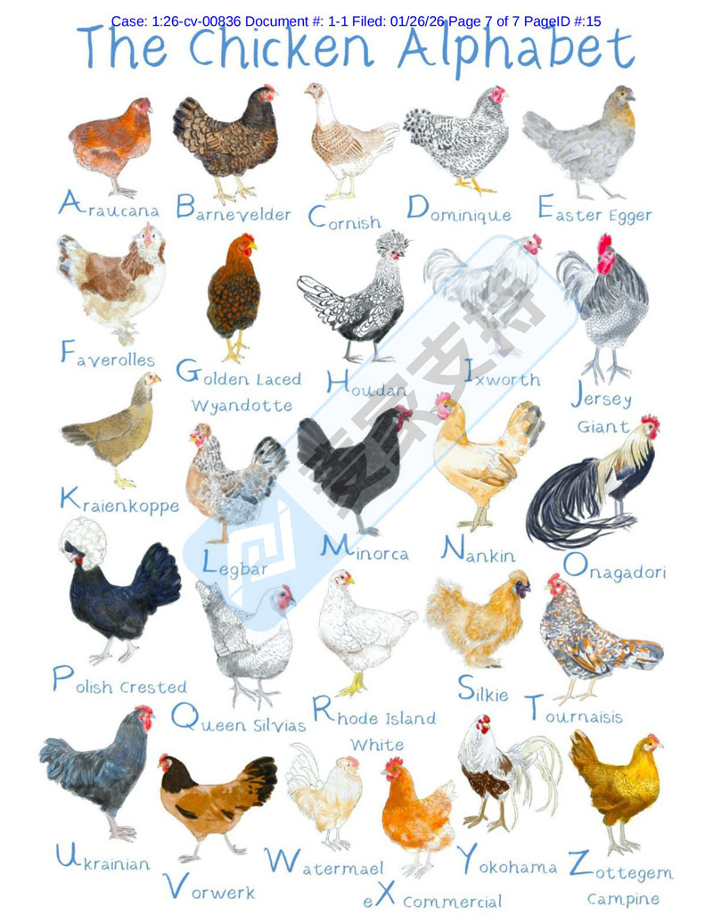 本案是keith律所代理英国艺术家Rebekah Leigh Marshall发起的版权维权案件,原告于2025年5月14日在美国共注册有4个版权,均与母鸡为主题,本案主要针对其中3个作品发起,共有113店未经授权使用,被列入被告名单中!