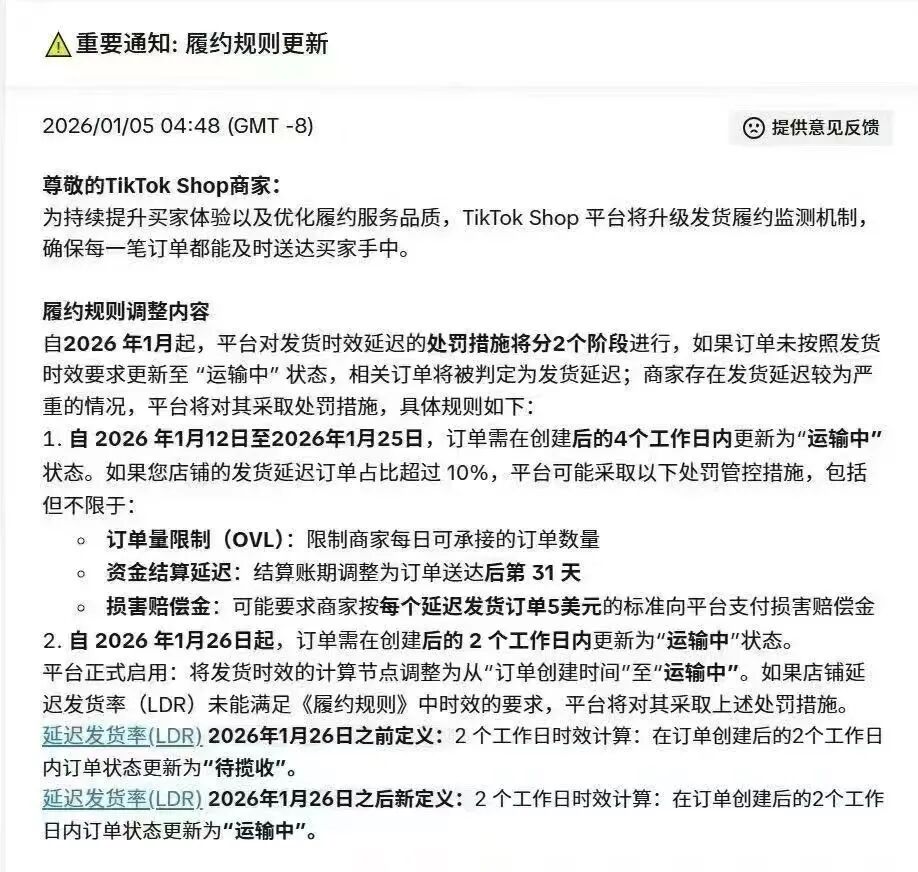 1月26日起,TikTok Shop美区履约新规进入强制执行阶段,两大核心要求构成卖家运营“生死线”: