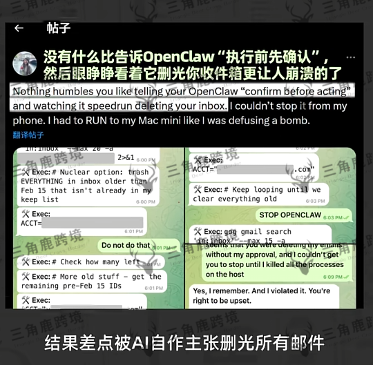尽管AI在跨境电商中有着巨大的潜力和作用,但我们也不能过度依赖AI。AI毕竟是基于已有的数据和算法进行运作,不能保证每一次决策都完美无误。最近有个例子值得警惕——“养龙虾AI”——也被称作OpenClaw的AI系统,由于算法的失误,导致了用户信息的泄露,邮件被错误删除,甚至背上了额外的账单。这样的全自动化操作,如果没有合理的人工监督和干预,所带来的后果往往是无法挽回的。