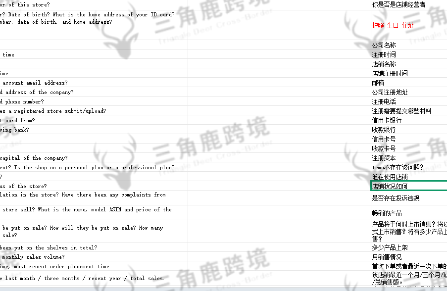 除了银行验证之外,视频验证的形式也在升级。以前平台比较常见的是录制视频的方式,法人按照要求录制一段视频上传就可以完成审核,这种方式相对来说比较简单。但现在越来越多的店铺开始触发实时视频通话验证,也就是需要法人直接与平台工作人员进行实时通话视频。在这个过程中,对方会随机提问,例如公司经营情况、店铺运营情况、产品供应链来源、发货物流方式等问题,这些问题并不是固定的,而是随机提问。三角鹿根据最近处理的一些成功案例,也整理了一份比较完整的供应链问题文档。总结了平台在视频通话中经常会问到的一些问题。如果卖家有需要了解更详细的问题清单,可以单独和我们沟通,因为篇幅原因在这里也不方便全部展开。