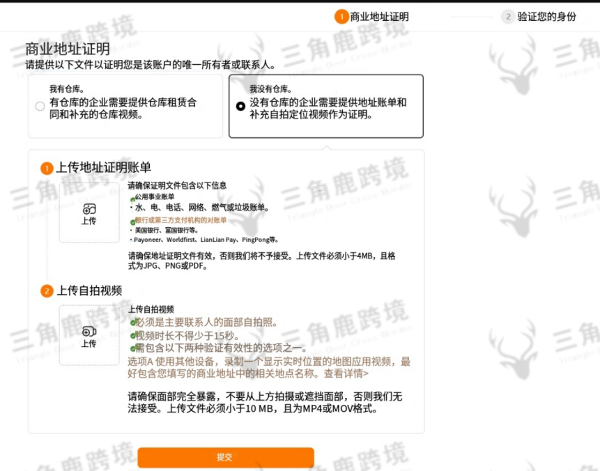 该页面是平台进行 商业地址验证 的审核步骤。若企业没有仓库,需要提交 地址证明账单和自拍视频 两项材料进行验证。地址证明可以是水电、网络、燃气账单,或银行、Payoneer、PingPong 等机构的对账单,文件需小于4MB,格式为 JPG、PNG 或 PDF。同时还需要上传一段 不少于15秒的自拍视频,视频中需清晰露出联系人面部,并通过地图定位展示与填写商业地址相关的位置。平台通过 账单 + 真人视频 + 定位信息 来确认企业地址和联系人真实性。