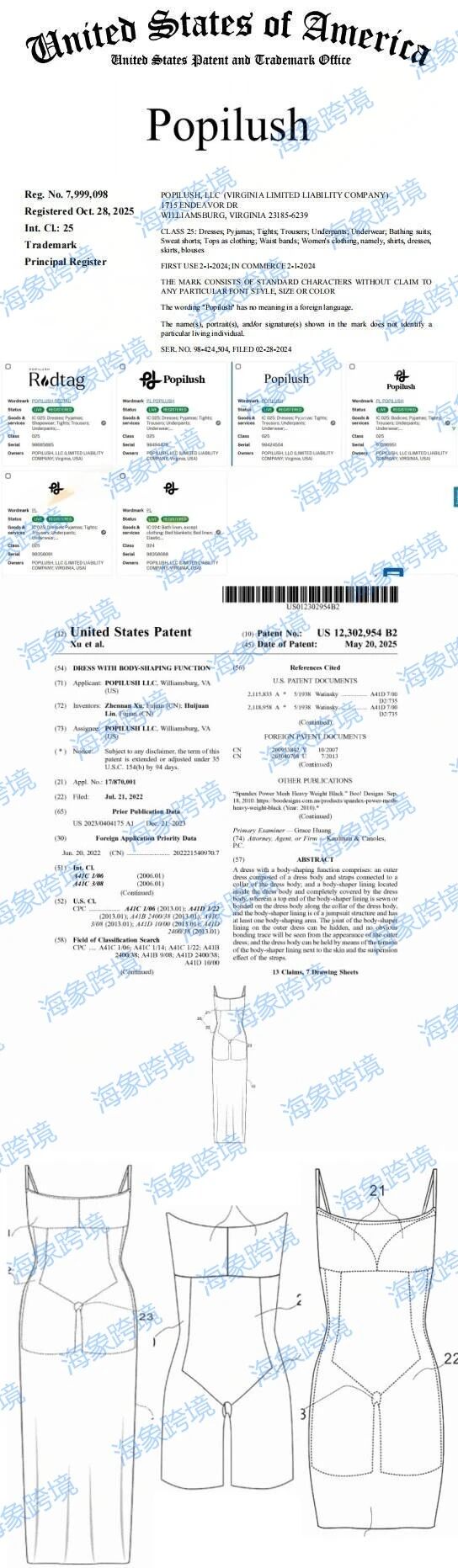 原告 POPILUSH LLC 由 Eve DeMartine 女士于 2022 年创立。Popilush 是一个专注于女性塑身服饰的美国时尚品牌,主打“内置塑形”理念,将塑形功能直接融入连衣裙、连体衣、泳装等日常服饰中,强调舒适、自然与外穿性。原告曾于2024年起多次发案,本案为商标+版权+专利全方位维权,无论是使用商标、专利还是原告产品图均有侵权风险,请相关卖家注意排查避雷!