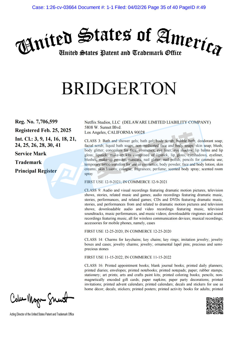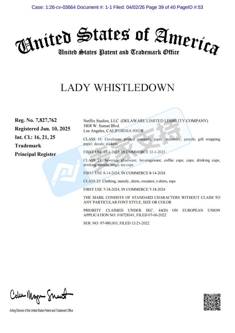 本案是GBC律所全新代理Netflix, Inc.针对其核心商标发起的维权案件,涉及其注册的Netflix、N、以及BRIDGERTON和LADY WHISTLEDOWN等多个文字和图形商标,涵盖服饰、家具装饰以及玩具等多个类目,未经授权使用则会面临TRO冻结风险!