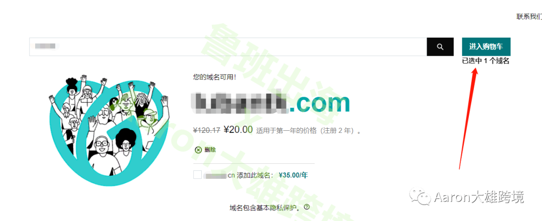 这里我选择一个.com的域名,小伙伴们可根据自己的喜好和预算选择需要的域名后缀加入购物车,不同域名后缀效果都一样。