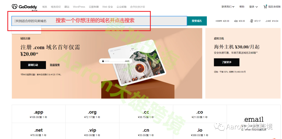 购买域名选择一个靠谱的购买域名网址,国内一般推荐阿里云,国外的话 Godaddy、Namecheap、Namesilo等等,这里我用Godaddy示范举例,购买域名的网址价格、操作界面等都有不同,大家可以选择自己习惯的平台购买。godaddy官网网址(godaddy.com)