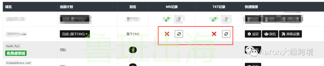 添加完成后在直接回到首页ForwardEmail会看到您刚填写的域名但是在MX记录和TXT记录显示是两个红色的X号,别急,说明还差最后一步前往域名购买网站添加一下解析就可以了。