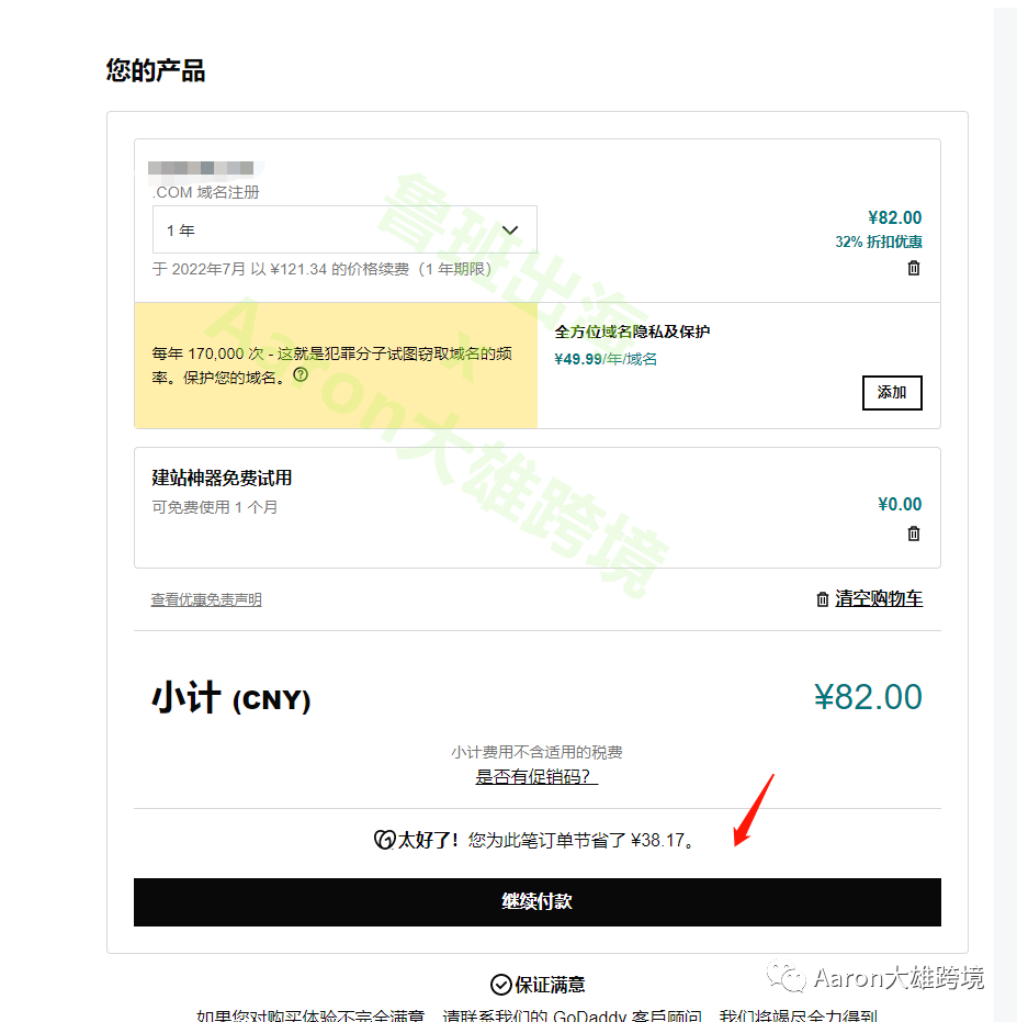 这里我选择了一个com域名,然后选择一年的费用点击继续付款,最低是选择一年,最高可以选择10年,这块根据自己预算选择即可