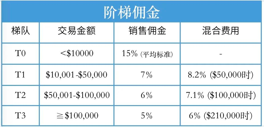 第三层级是5万到10万区间,佣金费率6%,需支付3000美金;