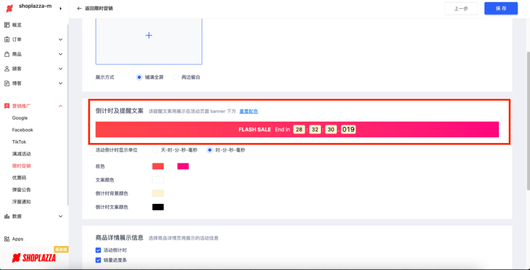 店匠后台支持限时促销功能,商家可以设置活动促销类型,促销活动时间和向消费者展示的商品数量,从而去引导和刺激用户的消费欲望。
