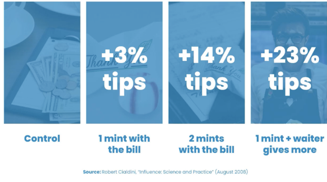 西奥迪尼提出,一个餐厅的消费收入实验,当结账时服务员递给顾客账单时不给薄荷糖,顾客将主观地依据服务水平给小费。而如果服务员给了一颗薄荷糖,小费则增加3%;如果给了两颗,小费则增加14%;如果结账时先给一颗,服务员回头再提供更多,所给小费则增加23%。