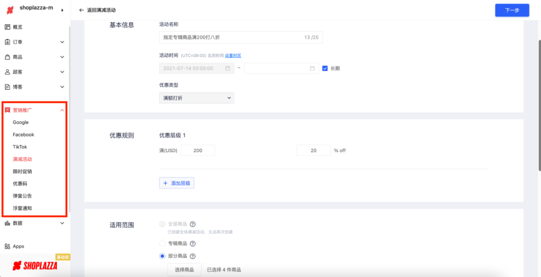 目前店匠也为独立站商家配置了满减活动,捆绑销售、优惠码等丰富等营销推广功能,并支持对优惠规则、适用商品范围进行精细设置,帮助商家对消费者的心理决策引导。