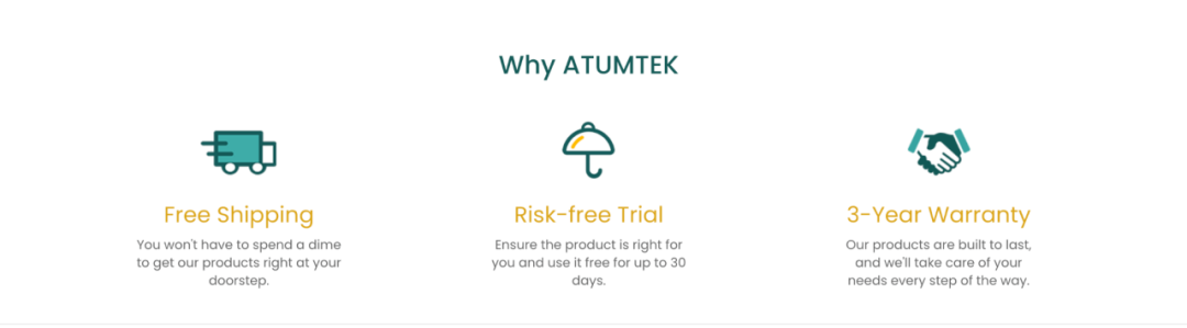 损失心理最常见的应用就是“包邮”。店匠服务的独立站 ATUMTEK 在店铺主页放上了“免费配送,30天免费试用,3年保修”信息,上述服务自然已经包括在成本之中,为什么不把邮费和商品分开标价,而是把这部分服务说成是免费呢?其原理就是将所有的成本叠加,避免让用户感觉到多次支出,减轻消费者损失心理。