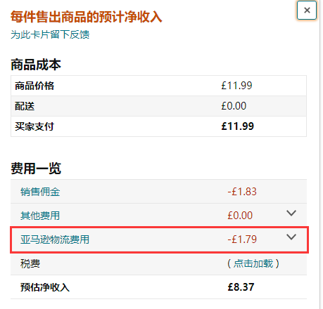 现在再看FBA费用已经调低至1.79英镑了。2.37-1.79=0.58,不要小看了这0.58英镑,这可相当于4.8人民币,当订单多起来的时候,这可是一笔不小的费用。