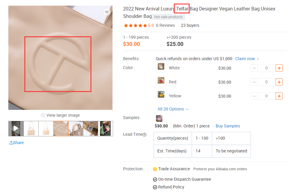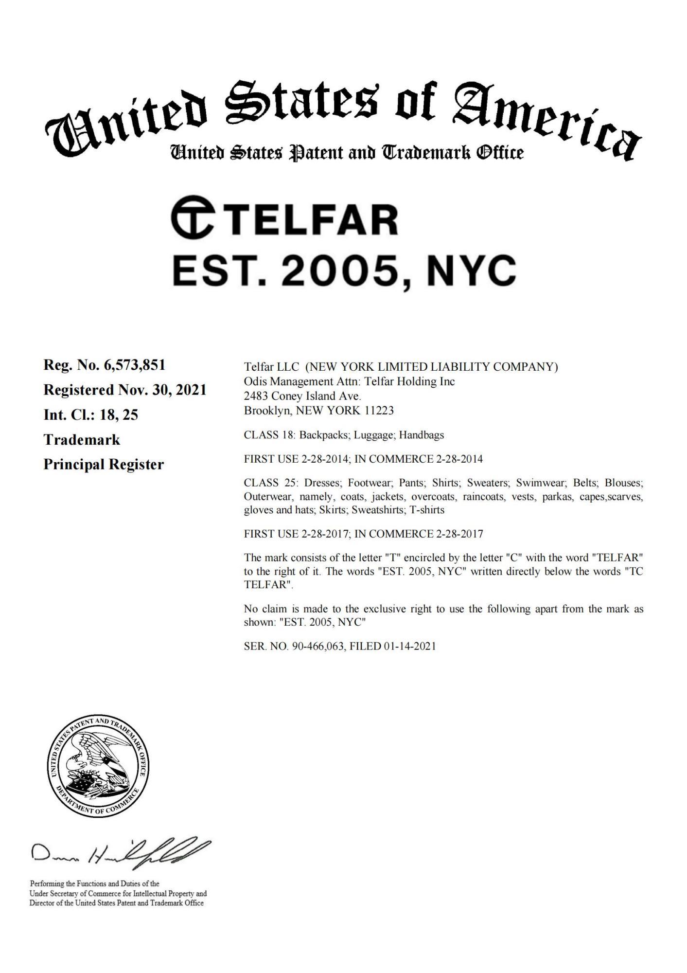 品牌介绍: TELFAR 品牌是国际名人Telfar Clemens于2010年创立的男装品牌。Telfar Clemens1985年出生于纽约,成长在利比里亚。他对于线条的雕刻在时尚届是独一无二的,也正是因此定义了这个品牌既不是概念式的也不是人们可以理解的,而是一种极端主义。 品牌官网:https://shop.telfar.net/ 案件参数: 案件号:21-cv-6864、21-cv-6842、21-cv-6839 起诉时间:2021/12月 起诉类型:商标 品牌方:TELFAR LLC 代理律所:GBC 注册商标: 刊登举例:
