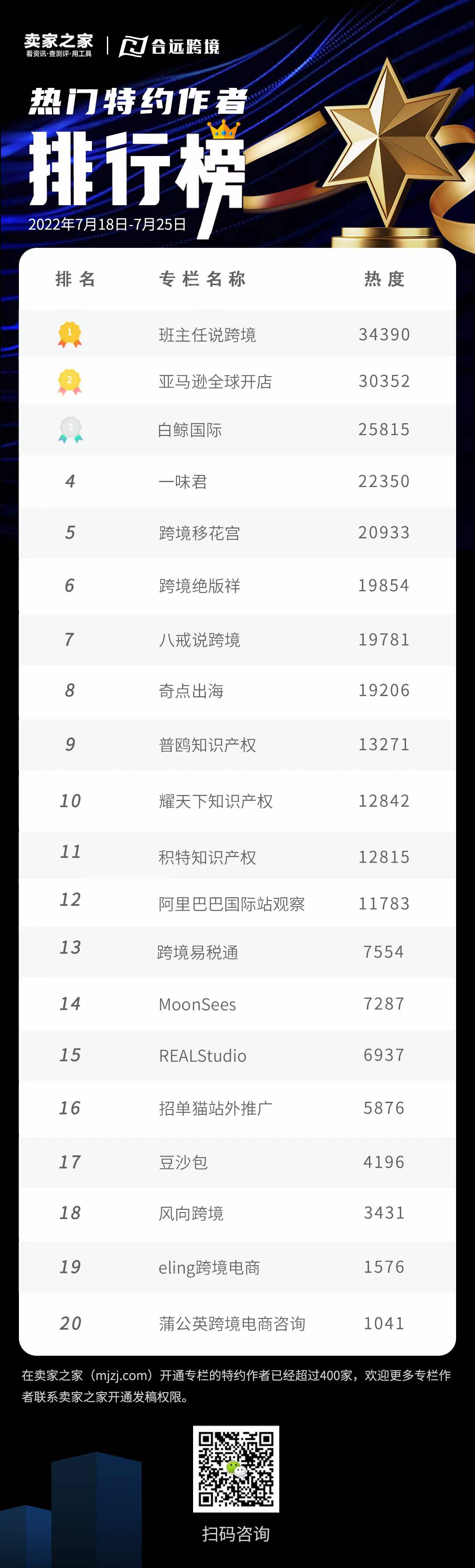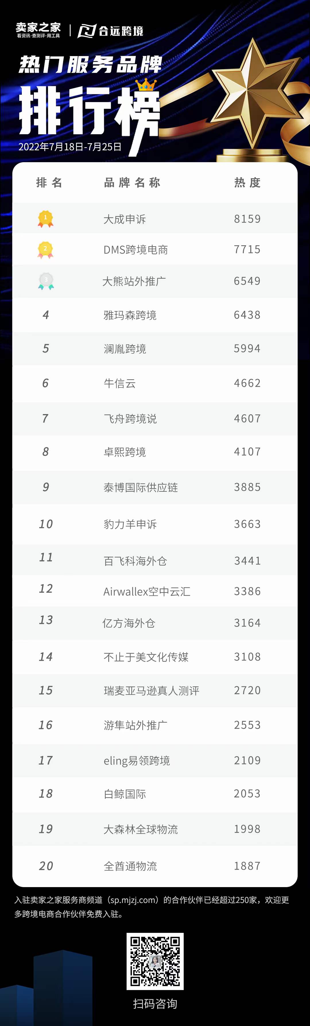 截至2022年7月25日,入驻卖家之家服务商频道(sp.mjzj.com)的跨境电商行业合作伙伴已经突破250家,开通特约作者专栏权限的伙伴已超过400家。感谢合作伙伴对卖家之家的的支持和关注,卖家之家将每周汇总综合数据形成周榜单供合作伙伴参考。最新一期榜单如下:
