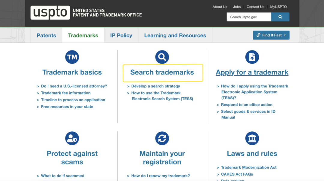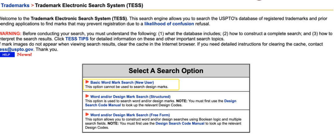 选择“Trademarks”-“Search trademarks”-“Basic Word Mark Search”,输入你已经选好的名字,查看是否已经被注册为商标。