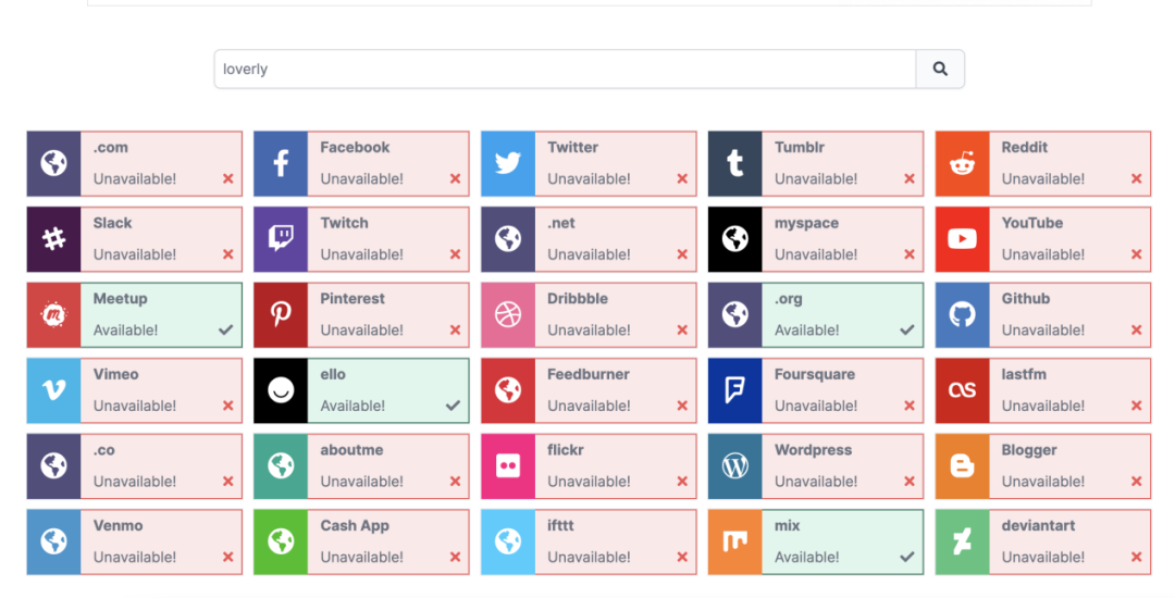这个网站能够帮助卖家排除那些在主流平台中已经被注册过的名字。下图是输入“loverly”之后得到的结果。注意,除了关注在亚马逊上是否已被品牌备案过,也要关心在主要的宣传平台,如Instagram、Facebook是否有注册。当然,对于有的网站,可以通过在品牌名后加上后缀如“-official”“-product”来区分。