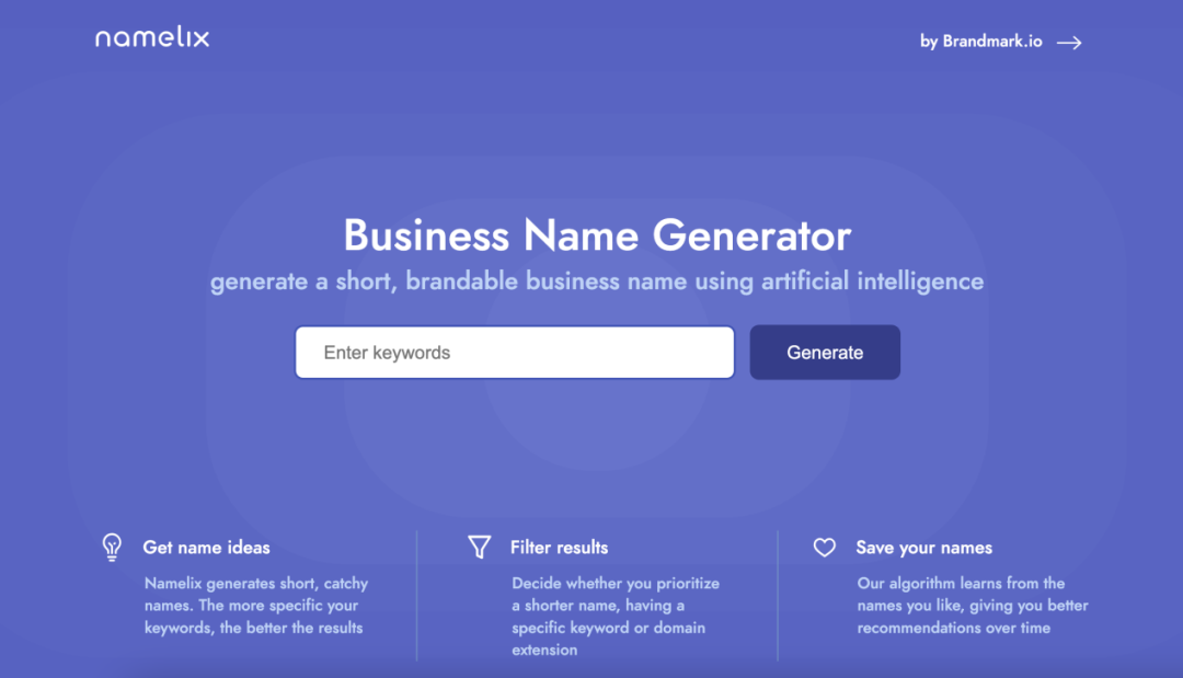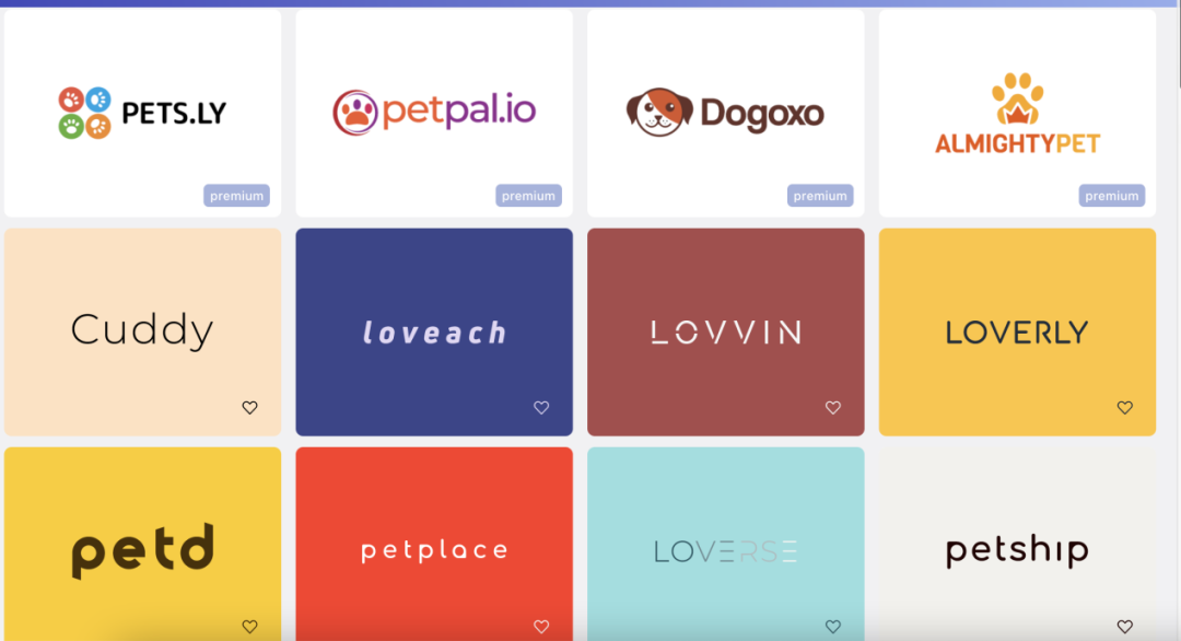 在中间输入你希望名称中包含的字母、单词,或者是所在的行业作为关键词,网站就能自动生成一些品牌名和简单的logo。比如输入“pet(宠物)”和“love(爱)”,选择低随机度和喜欢的风格,生成的结果如下:
