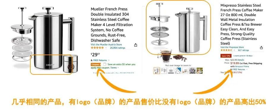 Logo可以说是品牌的“门面”,不仅能够加深消费者对品牌的认可度、产生信任感,更能够为产品带来更多溢价。以下图的两个咖啡过滤壶为例,有品牌logo的咖啡壶能够卖出比无品牌logo的产品高50%的价格。