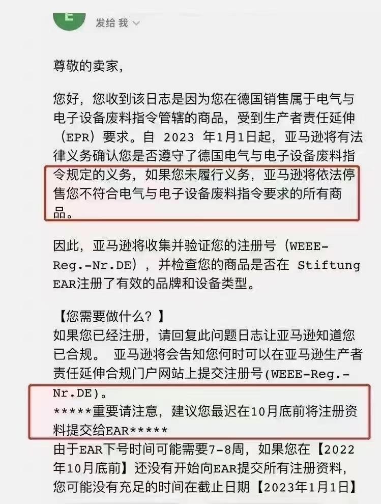 现在陆续有不少卖家收到邮件,邮件中亚马逊建议在德国销售属于电气与电子设备废料指令管辖商品的卖家,最迟在十月底提交资料注册德国WEEE,否则将有可能来不及在法规生效前完成注册。可能这样说,引起不了卖家的重视。那还是将这个说明白才好,为什么建议尽快注册。