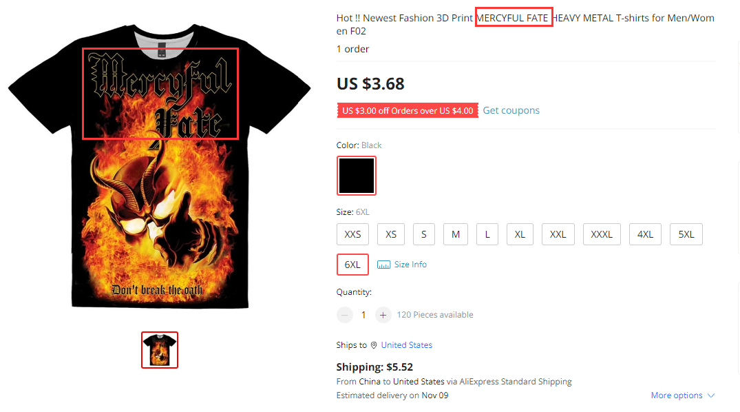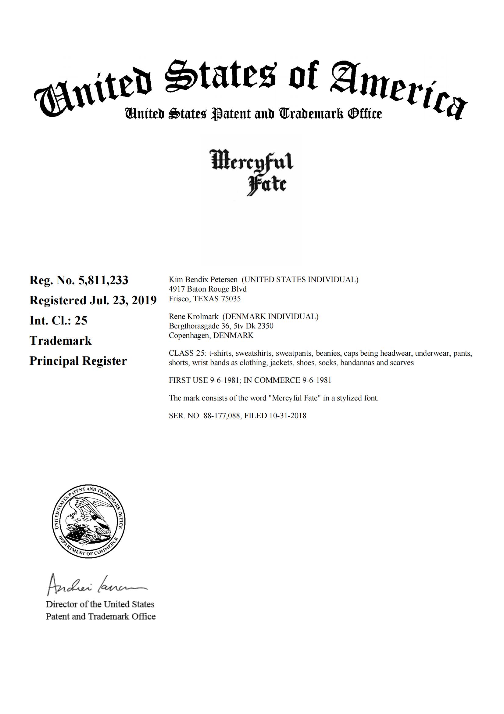 品牌介绍: Mercyful Fate是成立于1980年的丹麦重金属乐队。以其邪恶、黑暗的音乐风格收获关注。队内成员包括主唱King Diamond,吉他手Michael Dinner,吉他手Hank Shermann。曾发行专辑Melissa(梅丽莎)、Don't Break the Oath(不要打破誓言)。 品牌官网:https://hankshermann.com/mercyful-fate/ 案件参数: 案件号:22-cv-5231、22-cv-5235 起诉时间:2022/9/26 起诉类型:商标 品牌方:UNIVERSAL MUSIC GmbH d/b/a BRAVADO 起诉地:美国伊利诺伊州 代理律所:Keith 注册商标: 刊登举例: