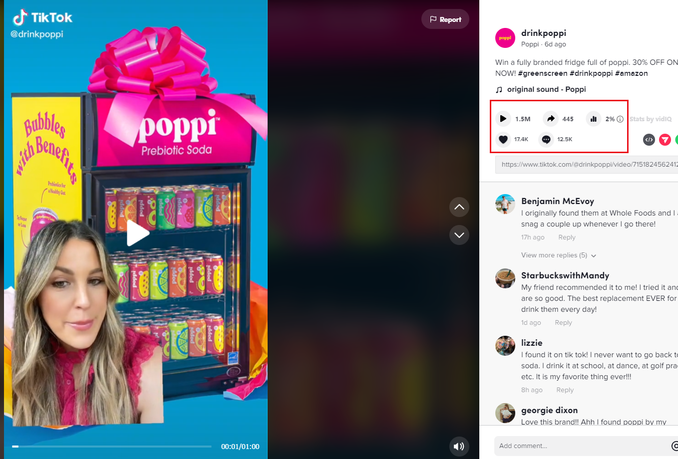 在 TikTok 视频中,Poppi 鼓励人们在视频中评论他们第一次发现品牌的地方,以便有机会赢得公司品牌的冰箱(giveaways),以庆祝 Prime 抢先体验销售。该公司还鼓励观众在活动期间访问亚马逊以享受 Poppi 产品 30% 的折扣。