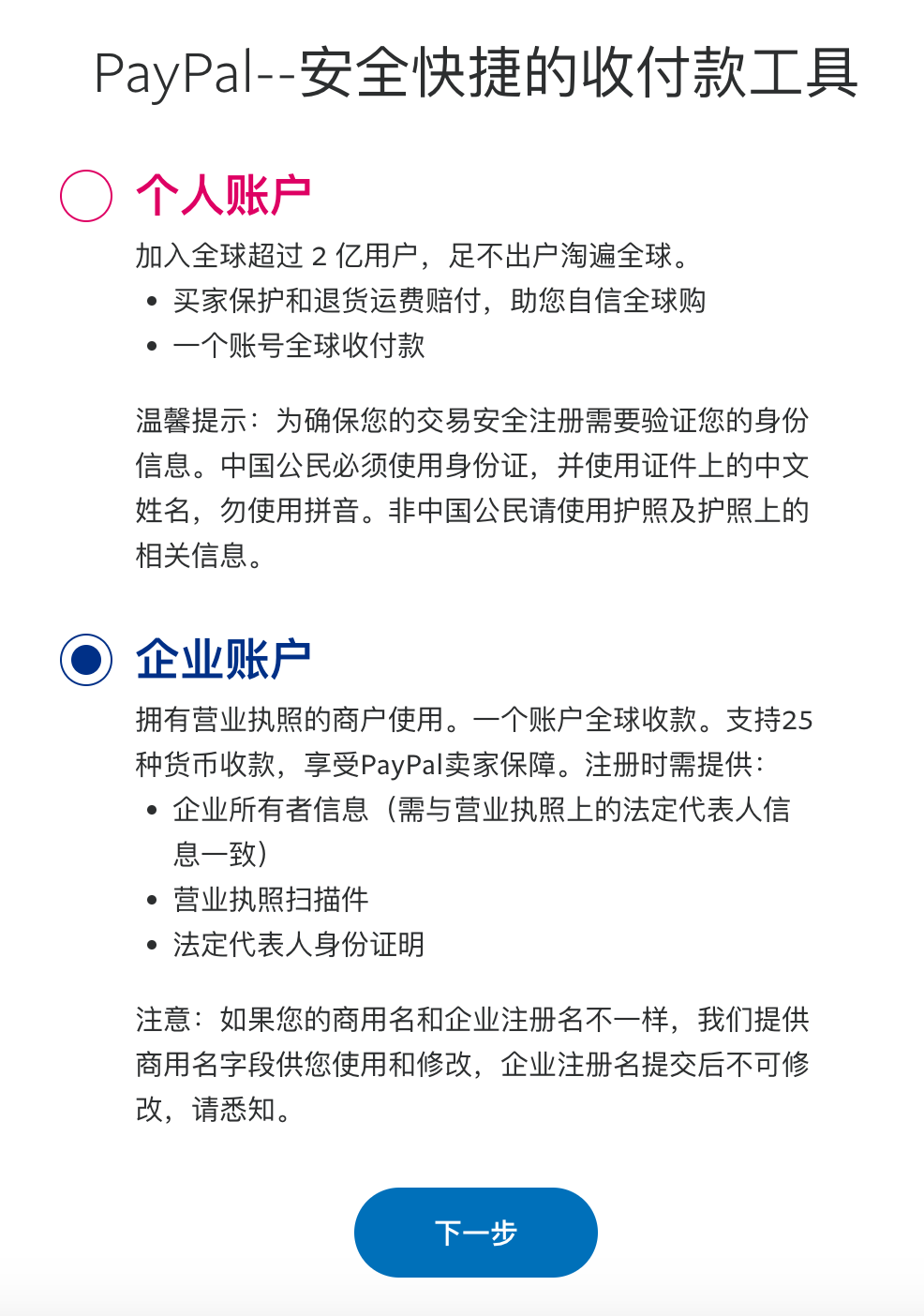 点击激活PayPal后,正式进入PP注册界面。在这里,您会看到两种注册类型,分别是个人账户与企业账户。因为独立站中的支付平台用于收款,所以必须以企业账户来注册。