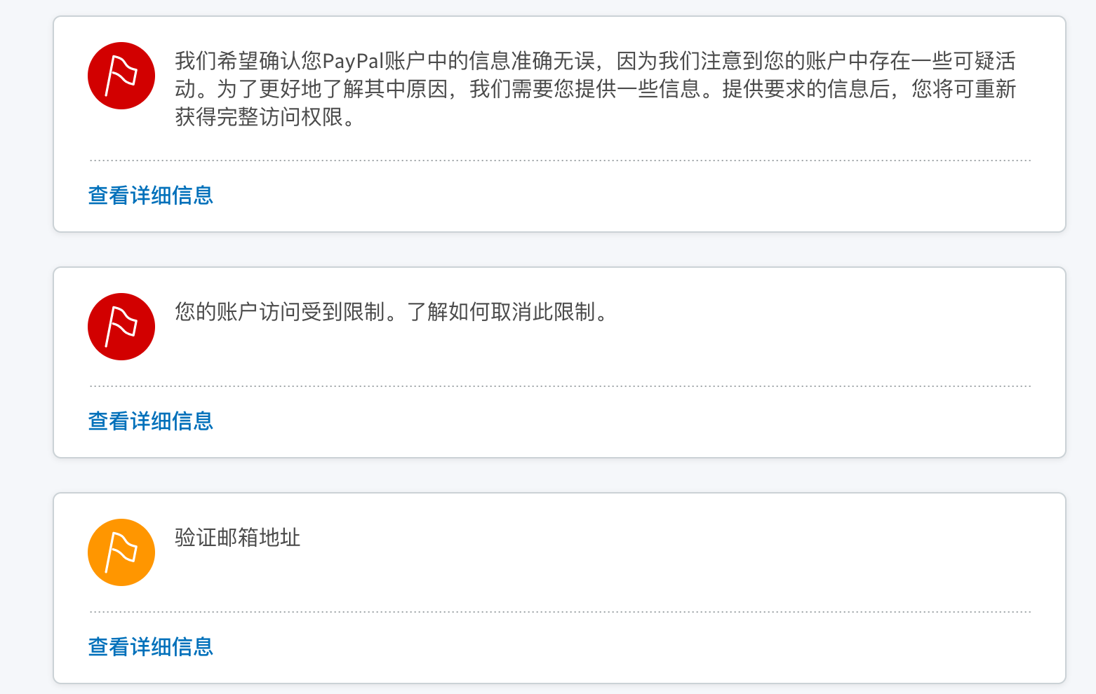 点击进入PP账户管理页,您会看到两个访问受限信息提示,以及验证邮箱地址消息提示。