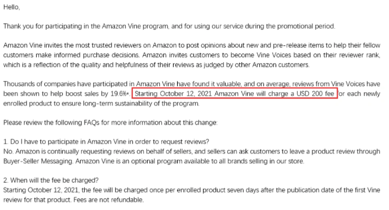 和VC时代不同,下放给普通账户使用的Vine计划有一些使用限制,比如最大注册数量和Review必须低于30个。不过对于卖家来说除了Vine亚马逊也没啥其他合法获评渠道了,还是得用。不过这个事在21年出现了转折,亚马逊宣布要对vine收费了,部分内测卖家先收到了亚马逊邮件通知,将会按照200美金每asin的金额收取vine计划费。