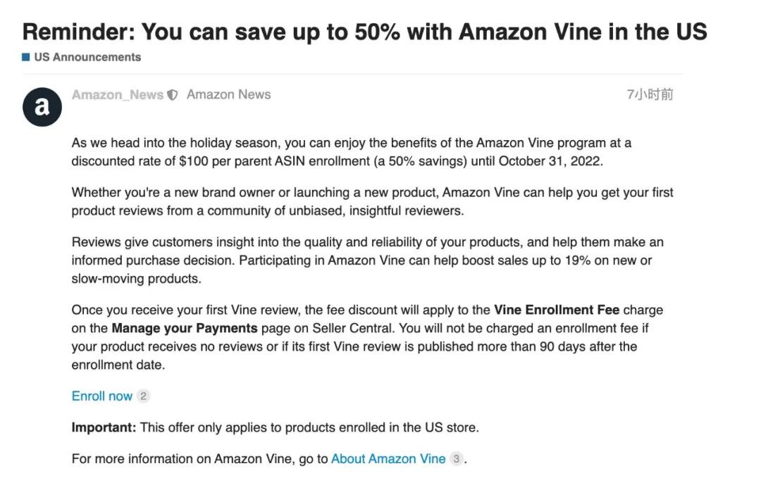 这两天亚马逊在后台发布新活动,卖家在10月31日之前注册Vine计划,可以享受半价获取Review!
