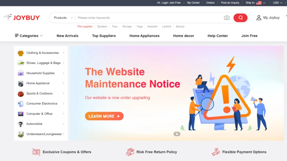 近日,京东旗下出海平台JOYBUY在网站维护中发布公告称:为了给广大客户提供更好、更全面的购物体验,JOYBUY将进行一系列“业务升级”,现将网站关停,同时交易现也已停止。