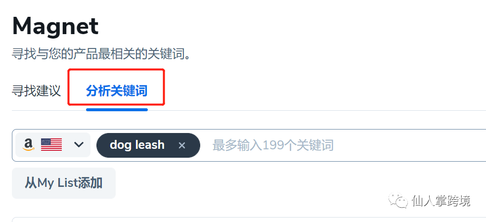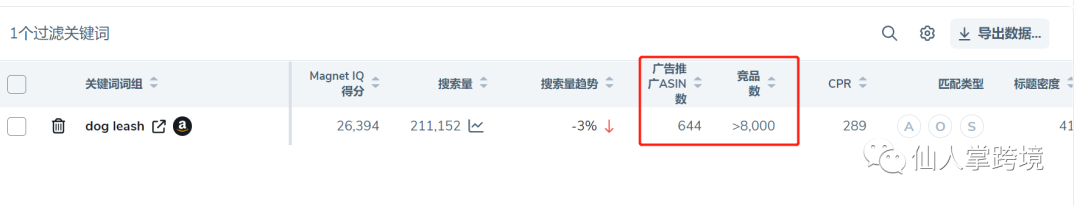 H10的Magnet现在有“分析关键词”这个功能,输入关键词之后可以看到这个关键词的一系列参数,今天我们以Dog leash(狗绳)这个关键词为例