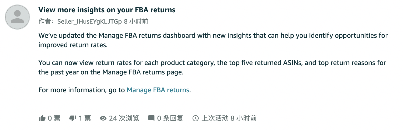 亚马逊美国站发布公告称卖家可以在更新后的亚马逊物流退货仪表板查看每个产品类别的退货率,前五个退货的ASIN以及过去一年的主要退货原因,从而帮助卖家降低退货率,以下是公告内容: