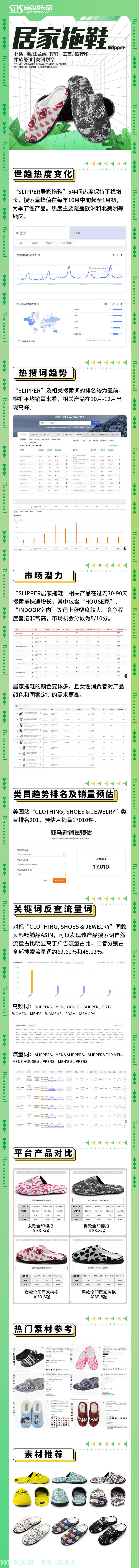 “Slipper居家拖鞋”相关产品在过去30-90天搜索量快速增长,其中包含“house家”、“indoor室内”等词上涨幅度较大。竞争程度普遍非常高,市场机会分数为5/10分。