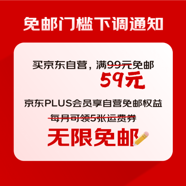 8月23日起,京东下调了自营商品包邮门槛。此前在京东购买自营商品,订单金额满99元才能包邮,目前门槛已降至59元。同时,京东PLUS会员享受无限包邮权益,也不再需要运费券。
