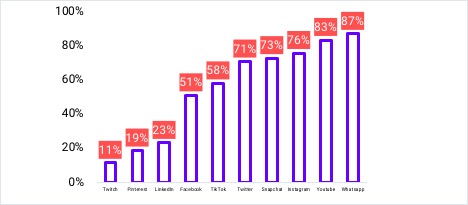MediaBrands在2022年的调查显示,平均而言,Instagram (76%)、Snapchat (73%)和Twitter (71%) 的平台使用渗透率都很高。此外,15%的受访者观看视频内容超过5小时。