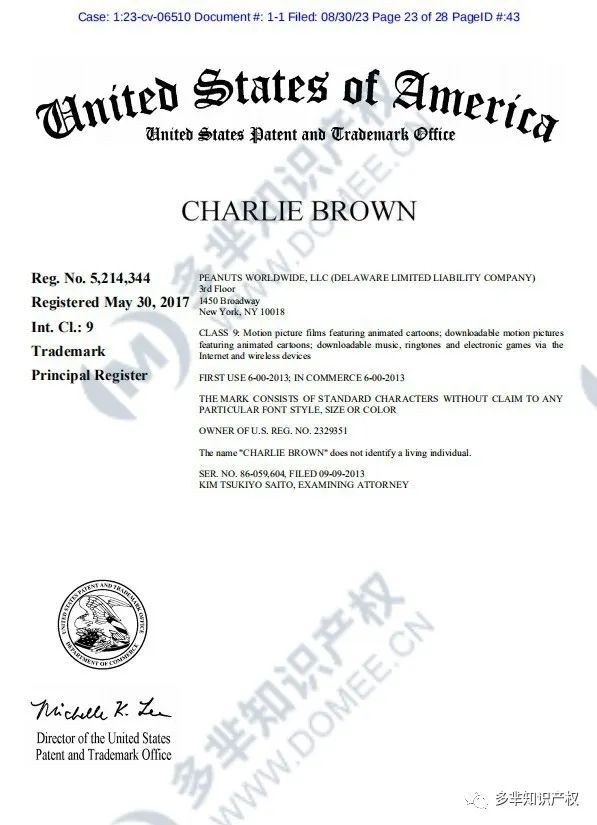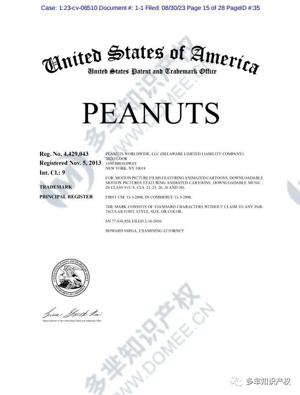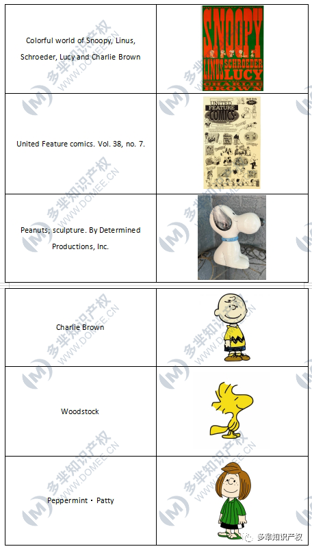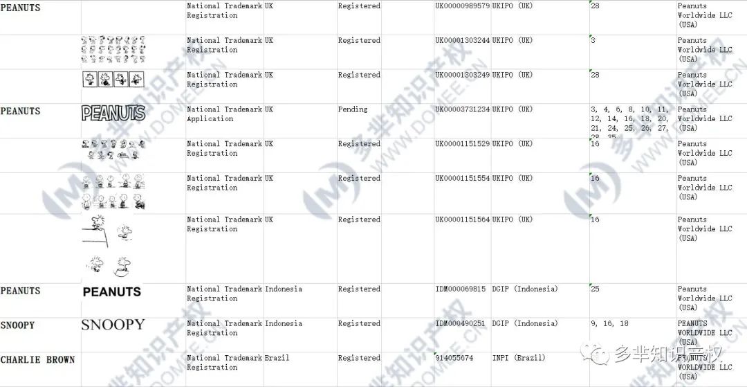 本次案件举证的商标主要以“SNOOPY”、“PEANUTS和“CHARLIE BROWN”的文字商标为主。举证商标共20个,主要涉及20、21、16、5、18、14、25、28、24、9、41类目。