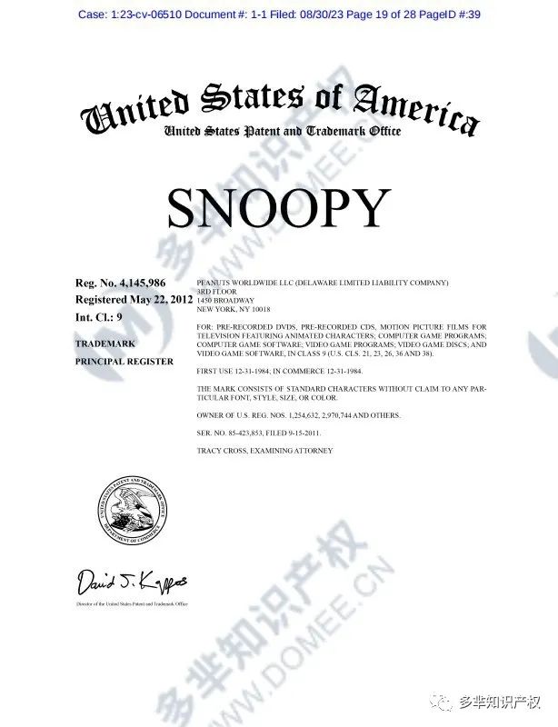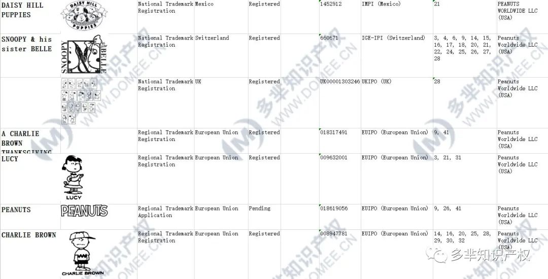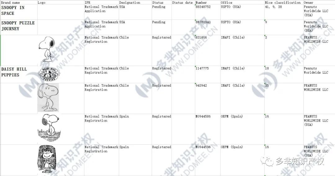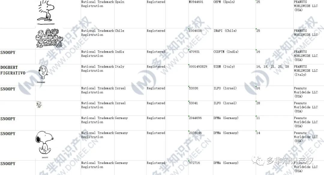 该品牌注册的其它商标多以Snoopy角色形象、相关的文字为主!以下是部分注册商标,卖家朋友们要多加留意,防止踩坑!