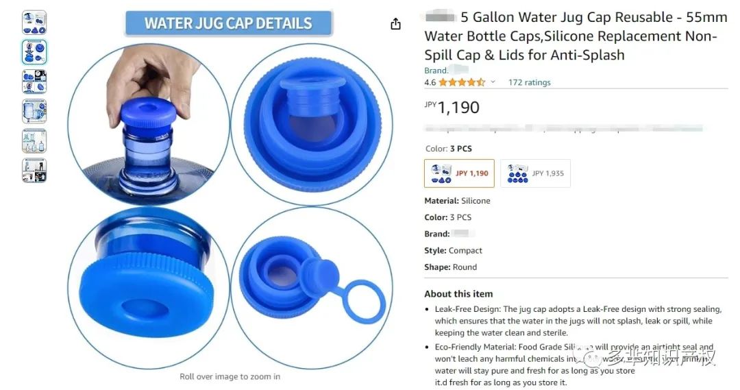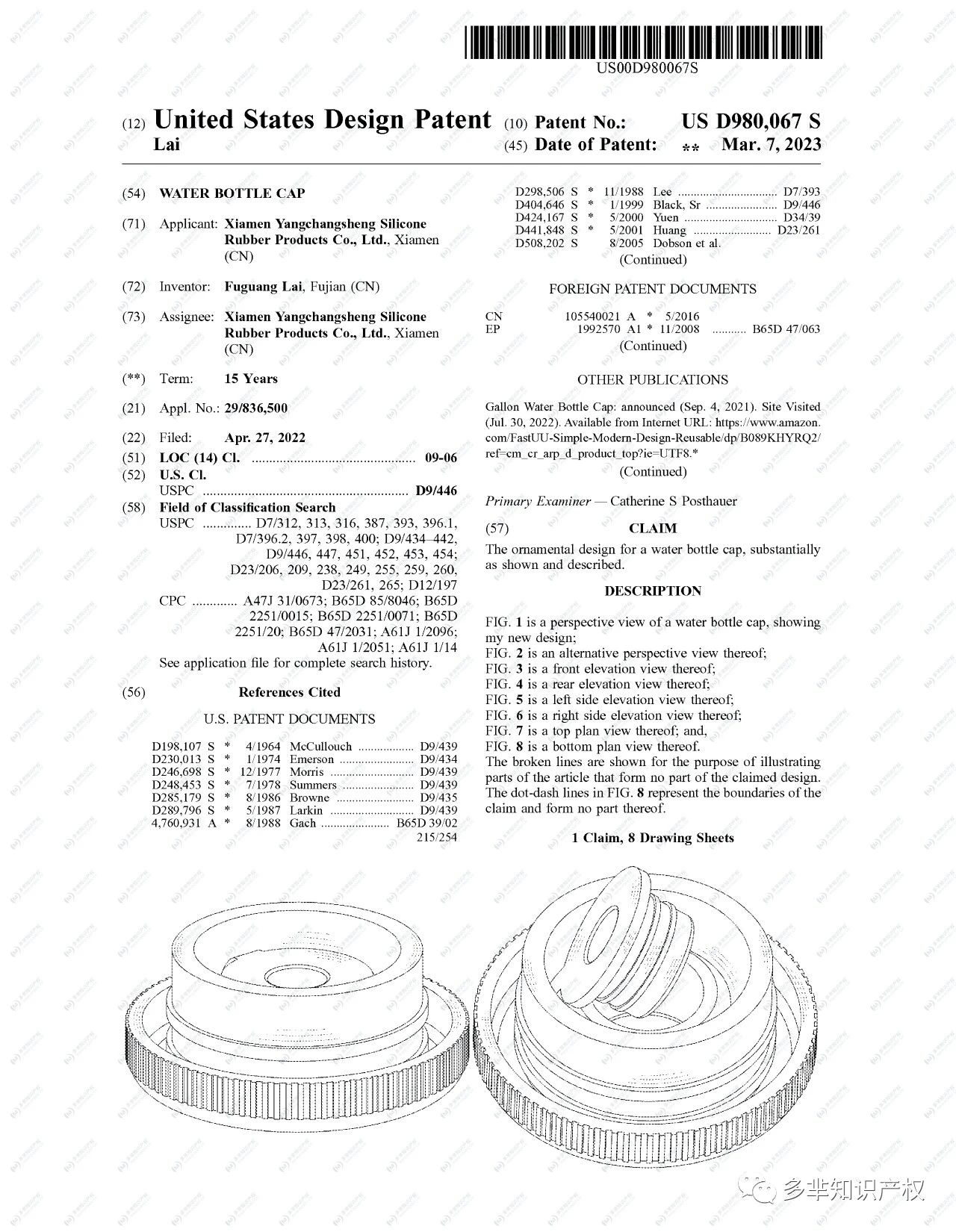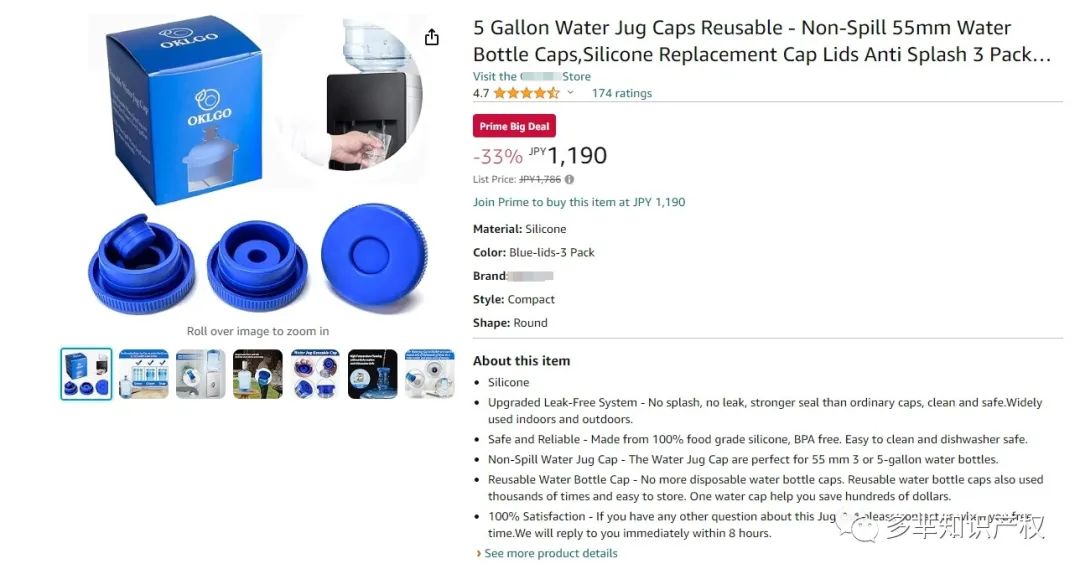 案件参数: 案件编号:2023-cv-14304 起诉时间:2023年9月29日 原告律所:Law Office Of Carla E Buterman LLC 原告方:Huawen Chen 侵权原因:专利侵权 注册专利: 本次举证的是美国的外观专利,专利名称是WATER BOTTLE CAP,专利号:US-D980067-S,于2022年4月27申请,2023年3月7日获得授权。 品牌介绍: 这个专利的产品是一款可重复使用的防漏水瓶盖,有可拆卸的内塞设计,这样可以使水瓶方便放置在顶部装载的饮水机上,而不溢出任何水。 产品相关示例: