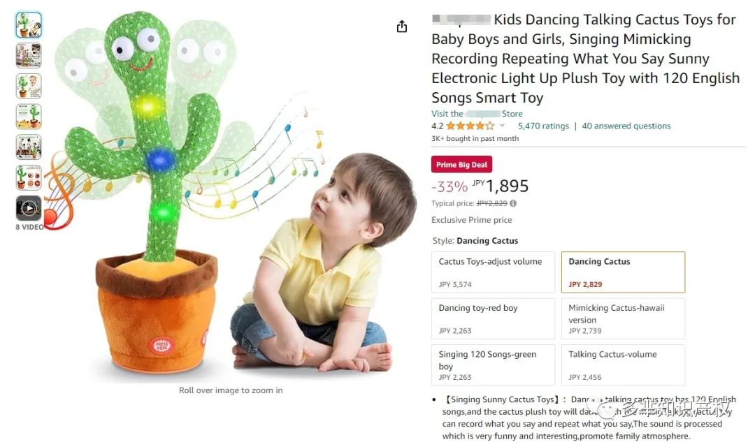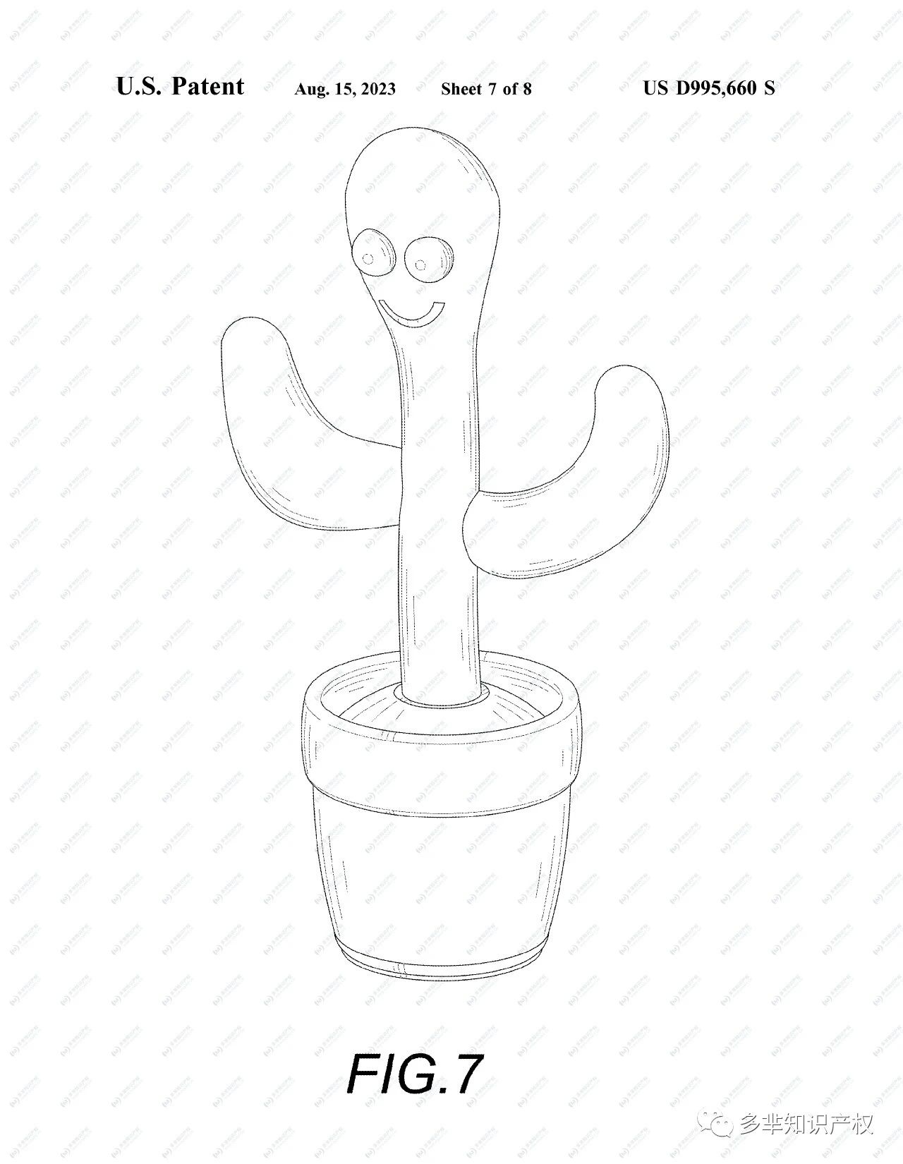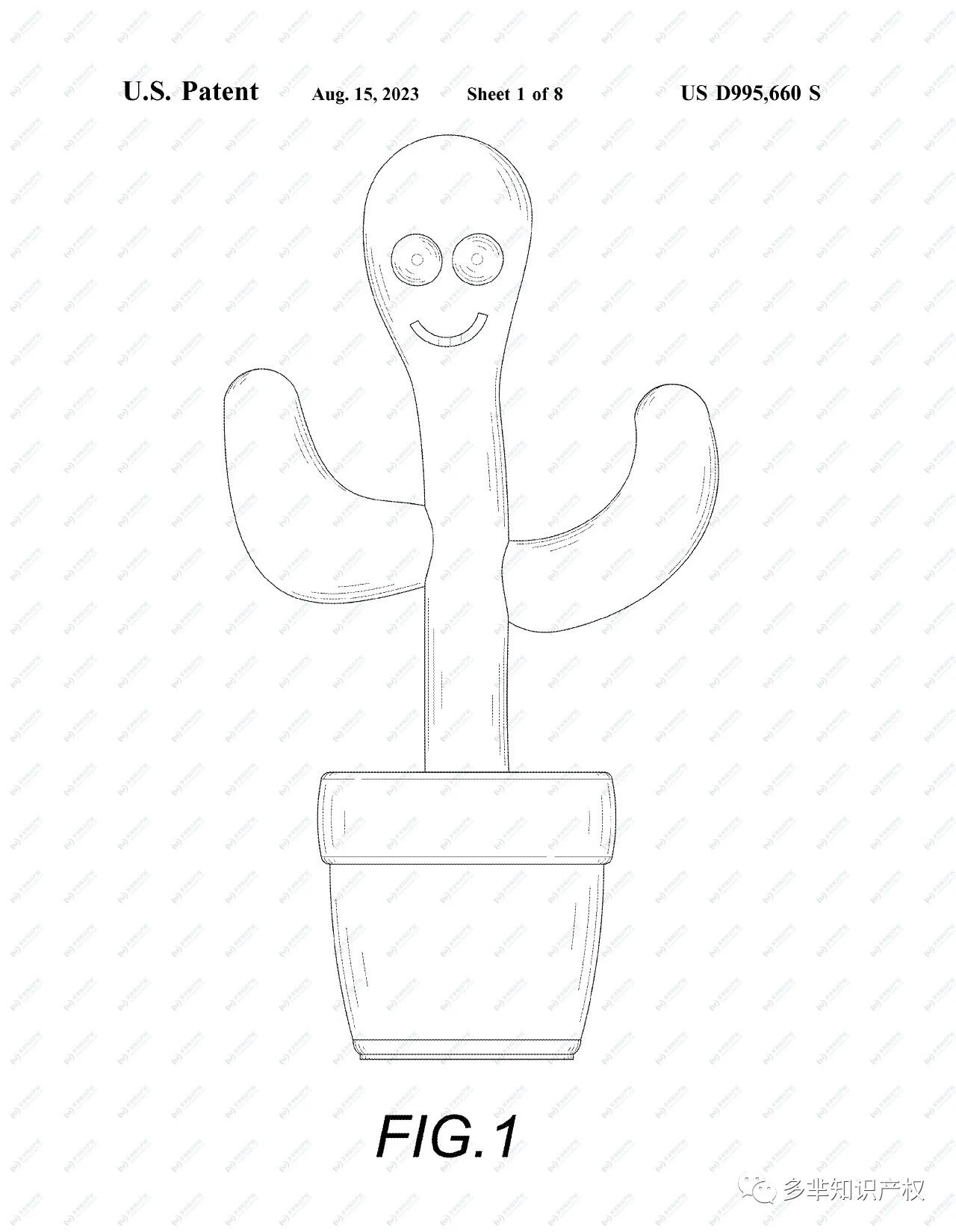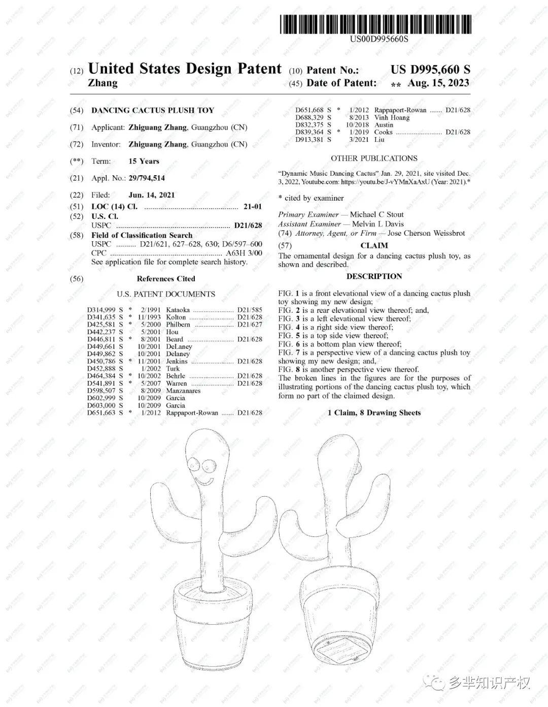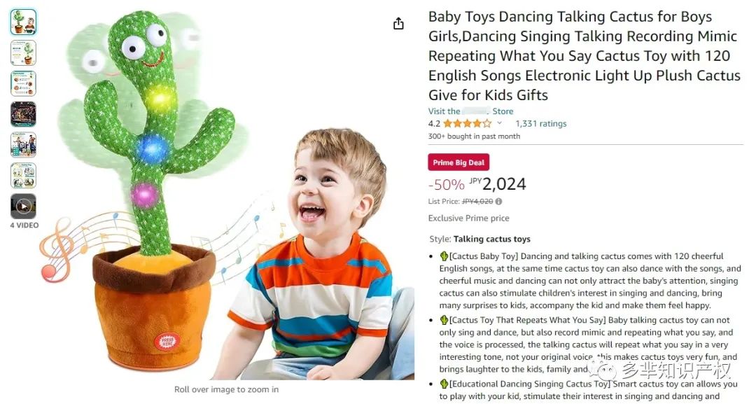 案件参数: 案件编号:2023-cv-14383 起诉时间:2023年10月2日 原告律所:Stratum Law LLC 原告方:Zhiguang Zhang 侵权原因:专利侵权 注册专利: 向左滑动查看图片 本次举证的是美国的外观专利,专利名称是DANCING CACTUS PLUSH TOY,专利号:US-D995660-S,于2021年6月14申请,2023年8月15日获得授权。距离发案时间还不到两个月,可见是有备而来。 品牌介绍: 原告是来自广州的Zhiguang Zhang,产品是一款会跳舞的仙人掌毛绒玩具,不但会唱歌和跳舞,还会用一个有趣的声音模仿和重复你说的话,声音经过加工,不再是你原来的声音,这使跳舞仙人掌玩具更有趣,也能锻炼孩子的语言表达技能。 产品相关示例: 在亚马逊上搜索DANCING CACTUS PLUSH TOY,搜索出来还是有许多相似产品在售卖,而且销量并不低,各位卖家注意自查,及时下架!以下为部分产品销售示例。