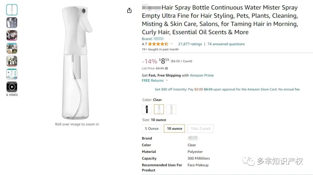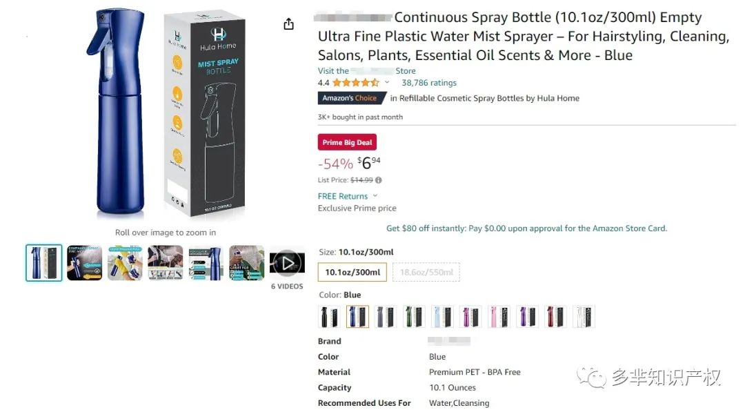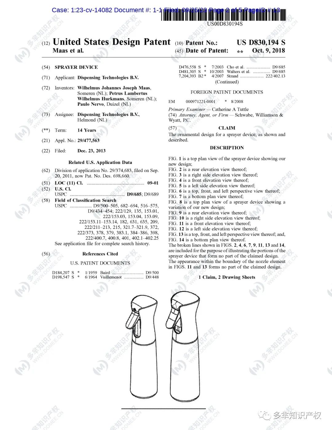 案件参数: 案件编号:2023-cv-14082 起诉时间:2023年9月25日 原告律所:GBC 原告方:Dispensing Technologies BV 侵权原因:专利侵权 注册专利: 本次举证的是美国的外观专利,专利名称是SPRAYER DEVCE,专利号:US-D830194-S,于2013年12月23申请,2018年10月9日获得授权。 品牌介绍: 这个专利的产品是一款喷雾瓶能使液体喷出细雾状,可以用于美容,包括发型设计、清洁、熨烫、给植物浇水、雾化空气清新剂、也可以作为喷油瓶使用等。 产品相关示例: