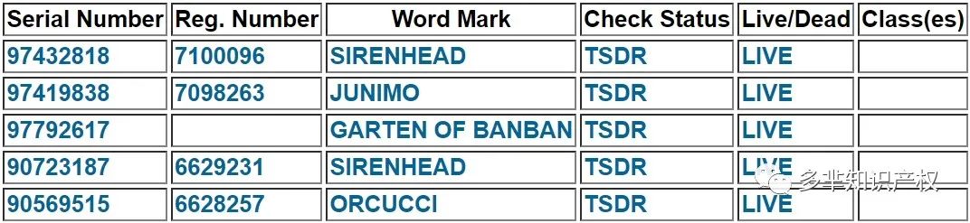 注册商标: 原告名下注册的商标共五个,除了之前发起过商标侵权诉讼的“SIRENHEAD”,还有“JUNIMO”、“ORCUCCI”以及还在申请中的“GARTEN OF BANBAN”。注册在25类手套、帽子、裤子、围巾、鞋、服装等;28类气球、游乐游戏机、护手带、玩具等。 于2022年2月和2023年1月曾起诉商标侵权,分别有164和114家店铺被告,预计此次也是差不多的被告数量。如有使用以上商标的建议自查一下平台后台有没有收到邮件或是资金能否正常提取,如果有异常要及时应对!