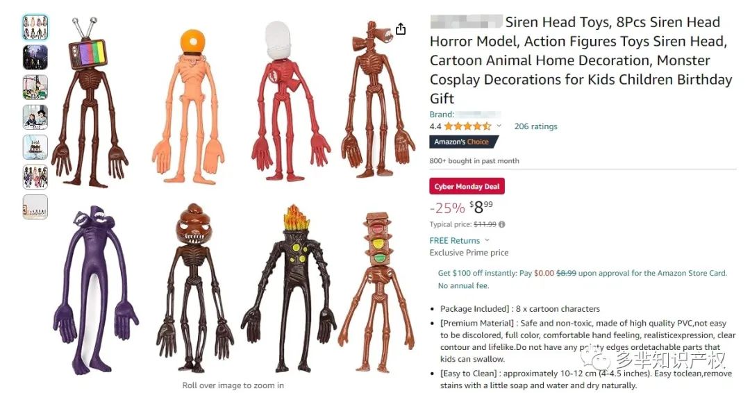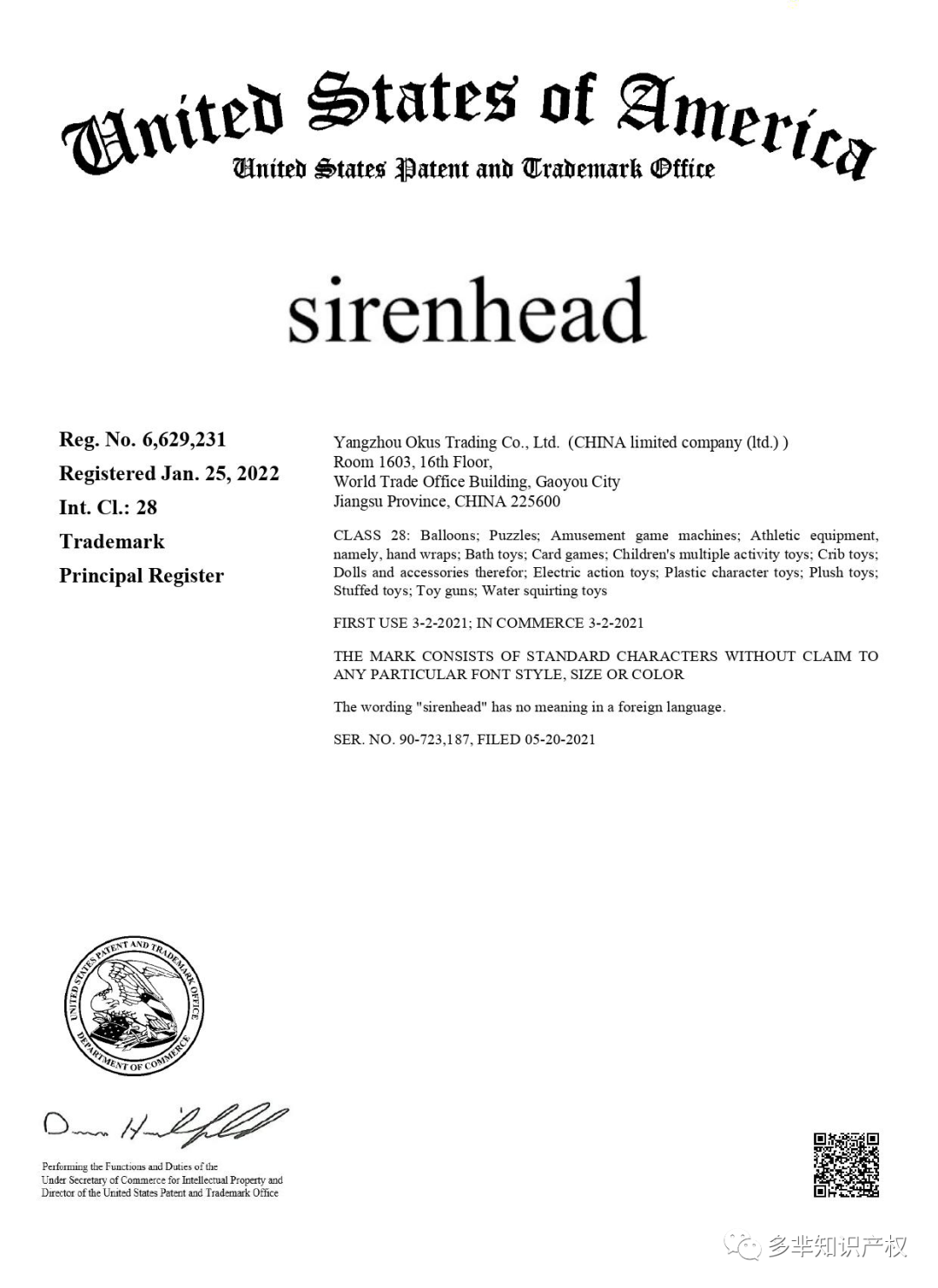 品牌介绍: Yangzhou Okus Trading Co., Ltd.是一家国内的公司,在世界范围内从事生产和分销业务。本次侵权的商标“SIRENHEAD”是加拿大艺术家Trevor Henderson 于2018年创作的虚构恐怖形象,是一个高大神秘的人形怪物,以其古怪的外表和由其头部的两个扩音器喇叭发出的各种各样的声音而闻名,通常称为“警笛头怪物”。