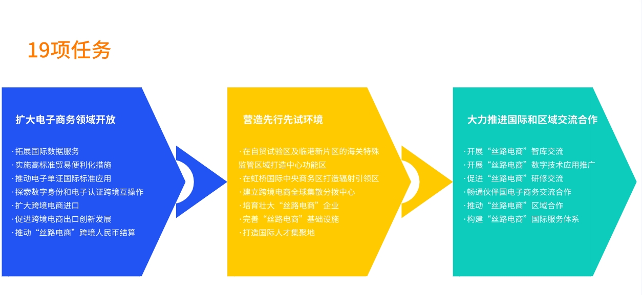 那么上海“丝路电商”合作先行区到底要做什么呢?我们可以从“四个一批”、“19项任务”来看看。